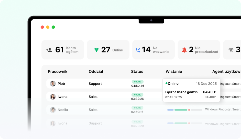 Wszystkie integracjeRingostat to chmurowa platforma dla contact center i call center, która pozwala centralnie obsługiwać połączenia i zgłoszenia, kontrolować jakość komunikacji oraz zarządzać pracą zespołów z jednego interfejsu.